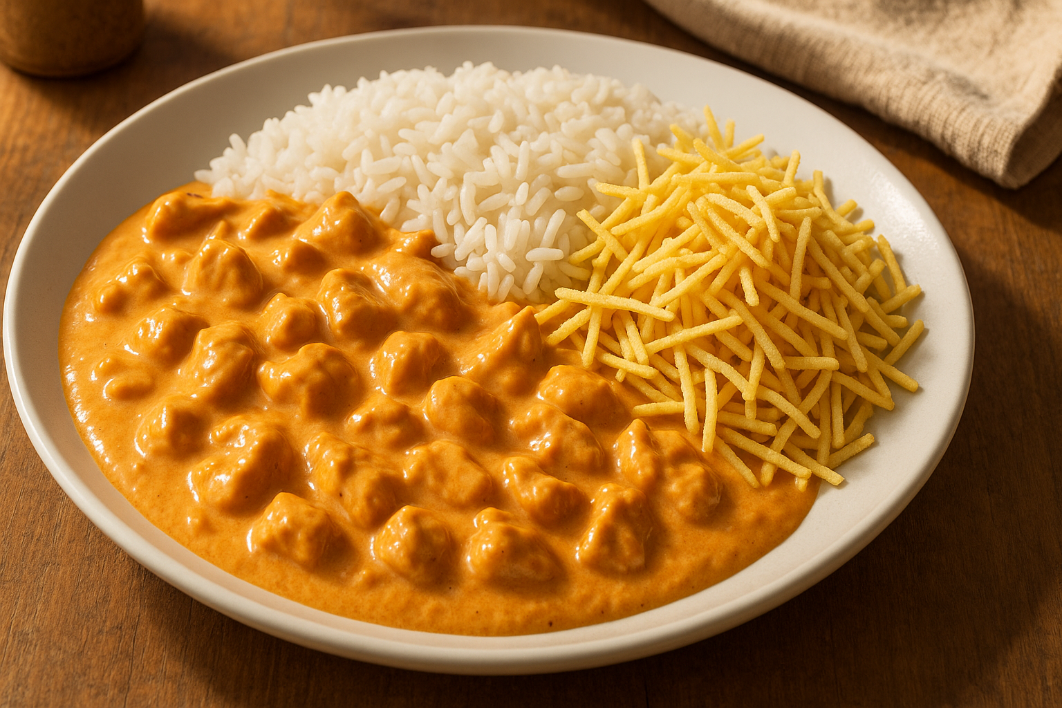 Sirva com arroz branco soltinho e batata palha só na hora de levar à mesa para manter crocância. Uma salada de folhas com limão equilibra bem o prato. Se sobrar, a reapresentação no dia seguinte funciona melhor com aquecimento em fogo baixo e um pequeno ajuste de líquido.